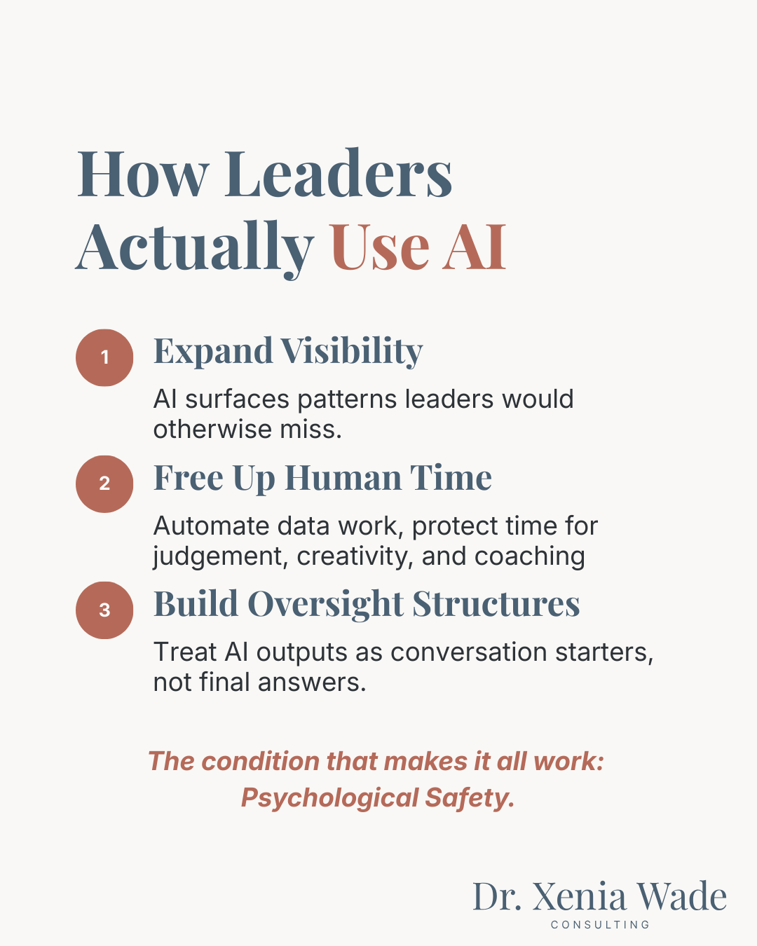 Dr. Xenia Wade is an independent consultant specializing in the Human Side of AI at Work. With a PhD in Human Resource Management, 7+ years as an Accenture Consultant, and experience across enterprise-scale transformations, she helps CHROs and People & Culture leaders build the human infrastructure that makes AI adoption actually work.